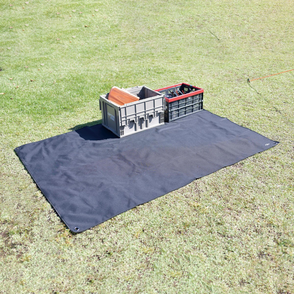 レジャーシートとしても、キャンプ時の荷物置きとしても使えるアウトドアシート。裏面は防水性の高いPVCコーティングなので安心してギアを置けます。φ19mmポールが貫通する大型グロメットを4点に配置。ペグダウンもでき、風でめくれやすい場面の対策にも。