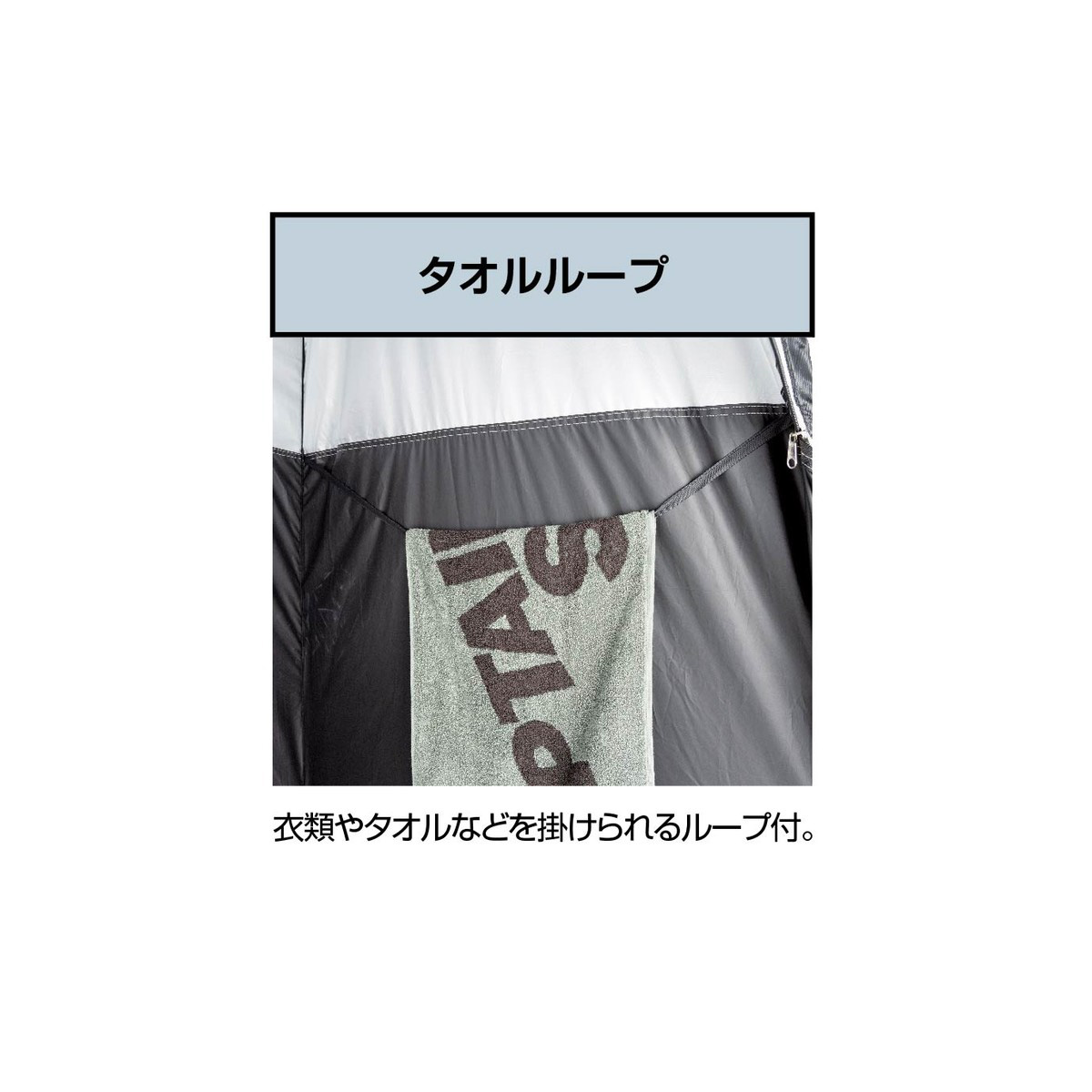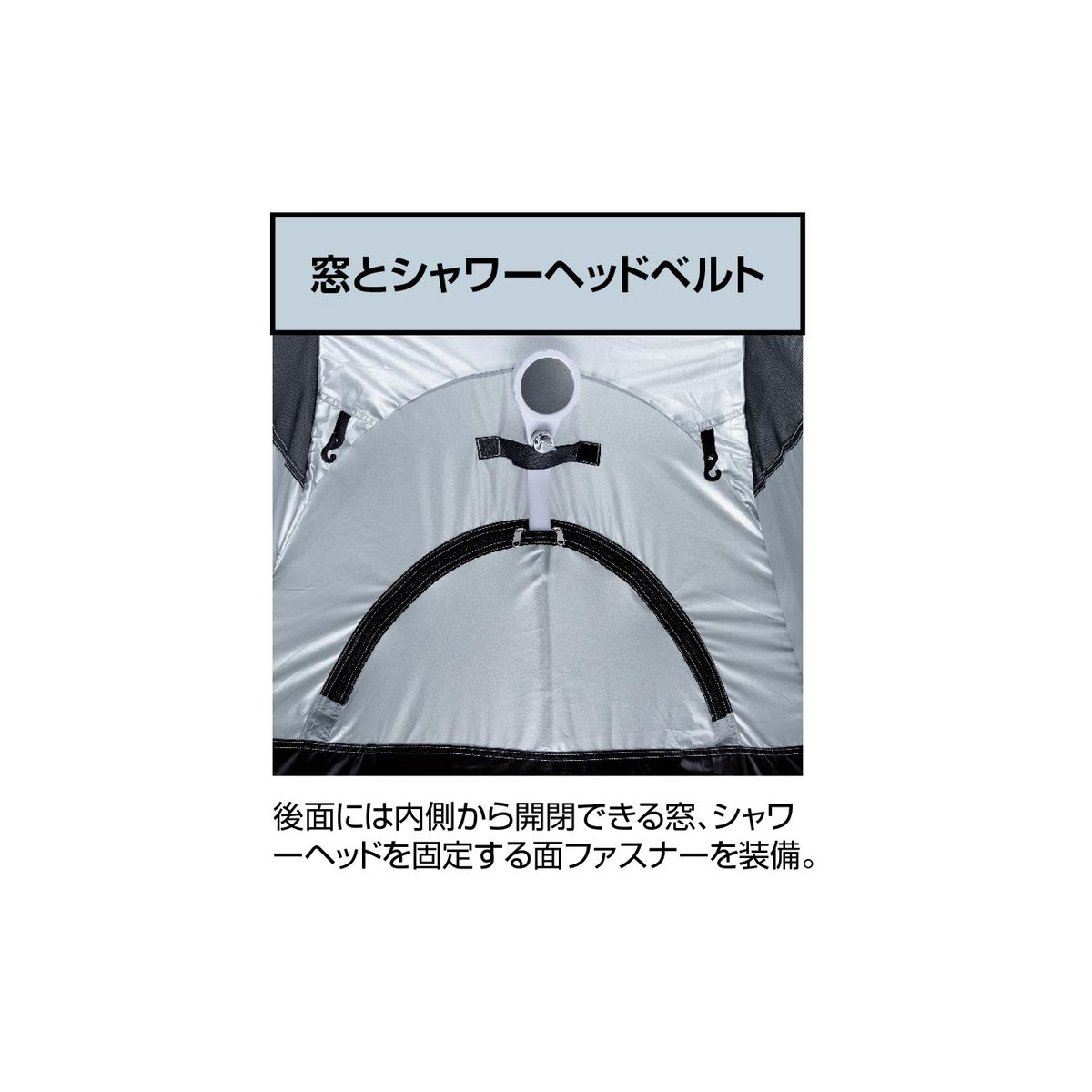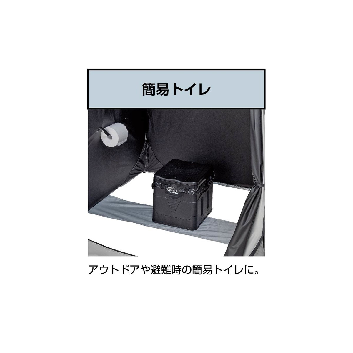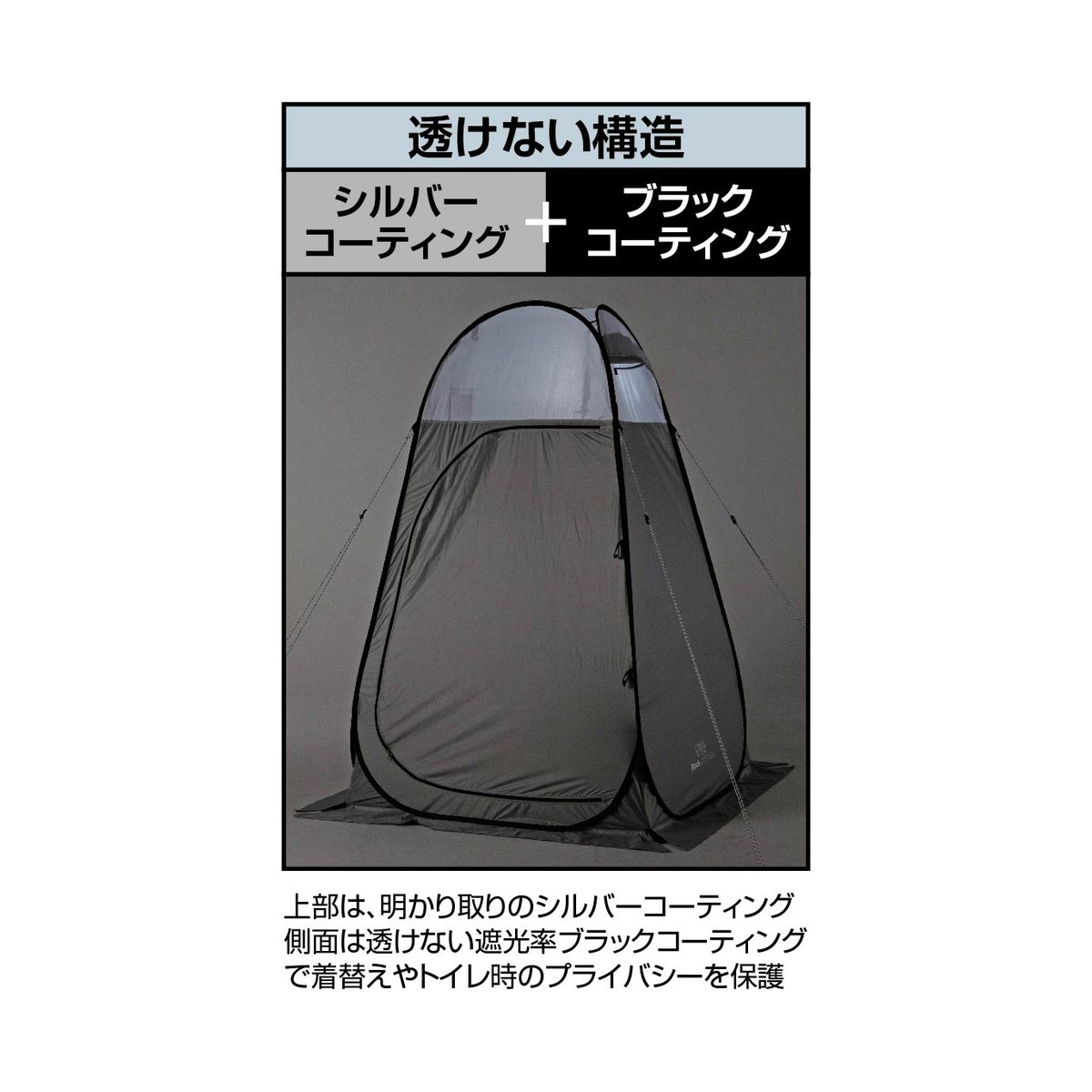 更衣室代わり、簡易トイレ、簡易シャワー室までこれ1張り。天井は明かりを取り込むシルバーコーティング、側面は透けにくいブラックコーティングでプライバシーを確保。防災時の簡易個室としても備えて安心です。