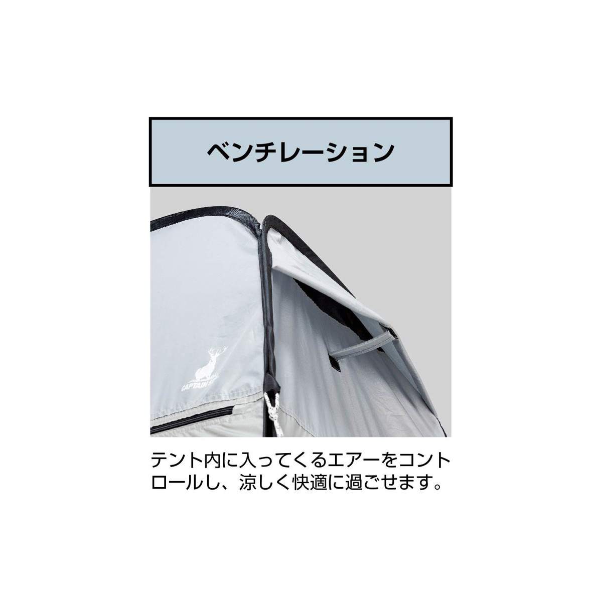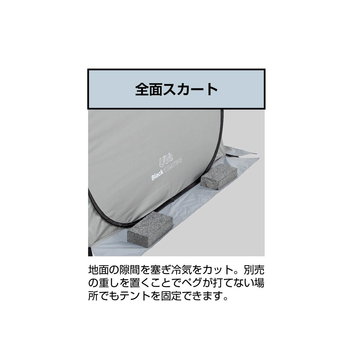 地面の隙間を塞いで冷気を抑制。さらにペグが打てない場所でも、スカート部分に重りを置くことで固定しやすく、設置場所の自由度が広がります。
