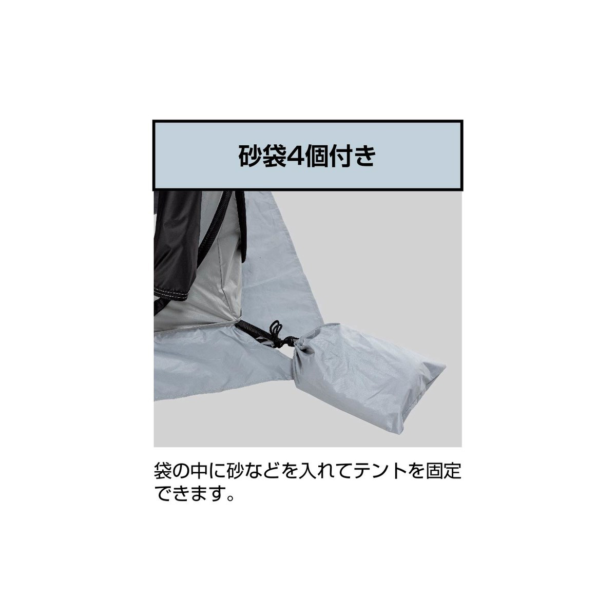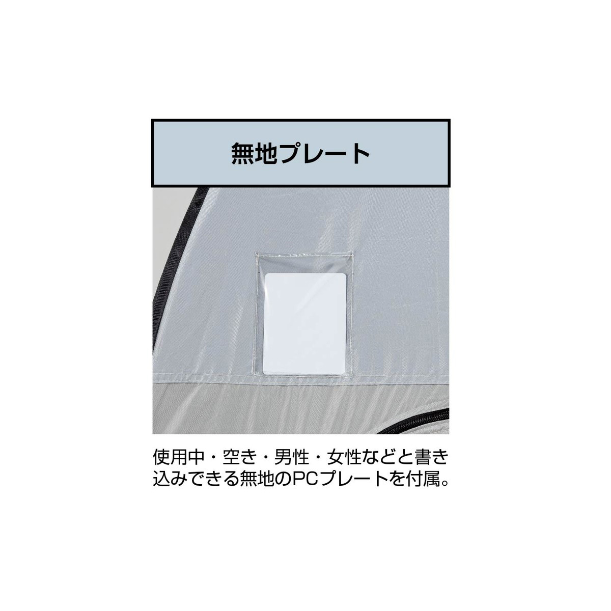「使用中/空き/男性/女性」などを書き込みできる無地PCプレート付き。ペグ・ロープに加え、砂袋4枚も付属し、シーンに合わせた設営をサポートします。