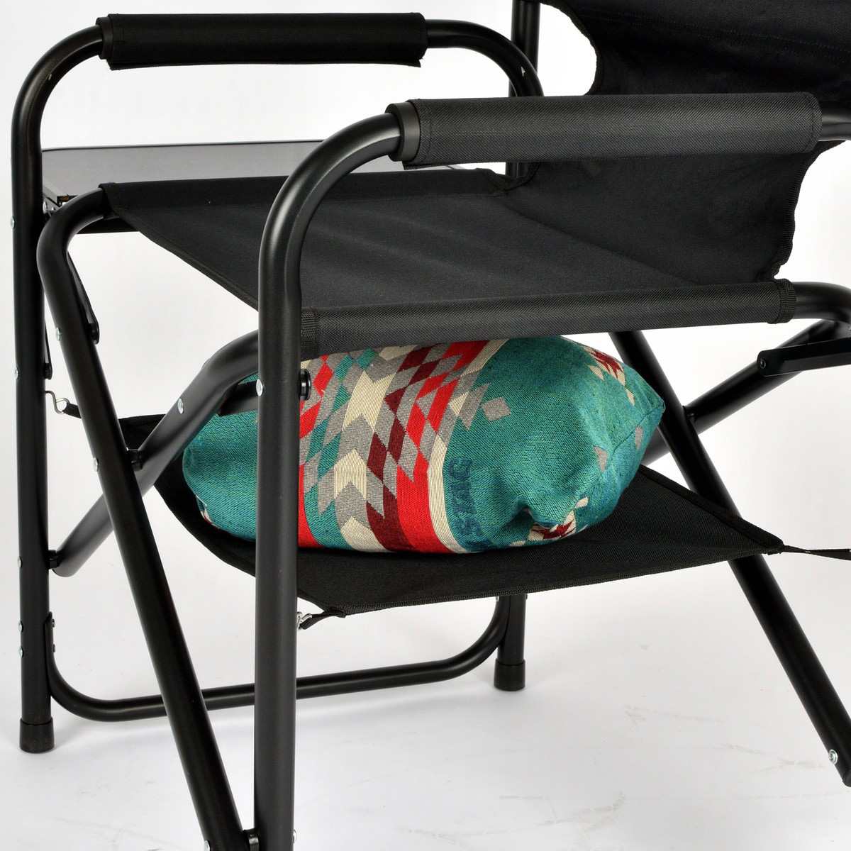 座面下の棚モックと、折りたたみ式サイドテーブルを備えたアルミディレクターチェアです。