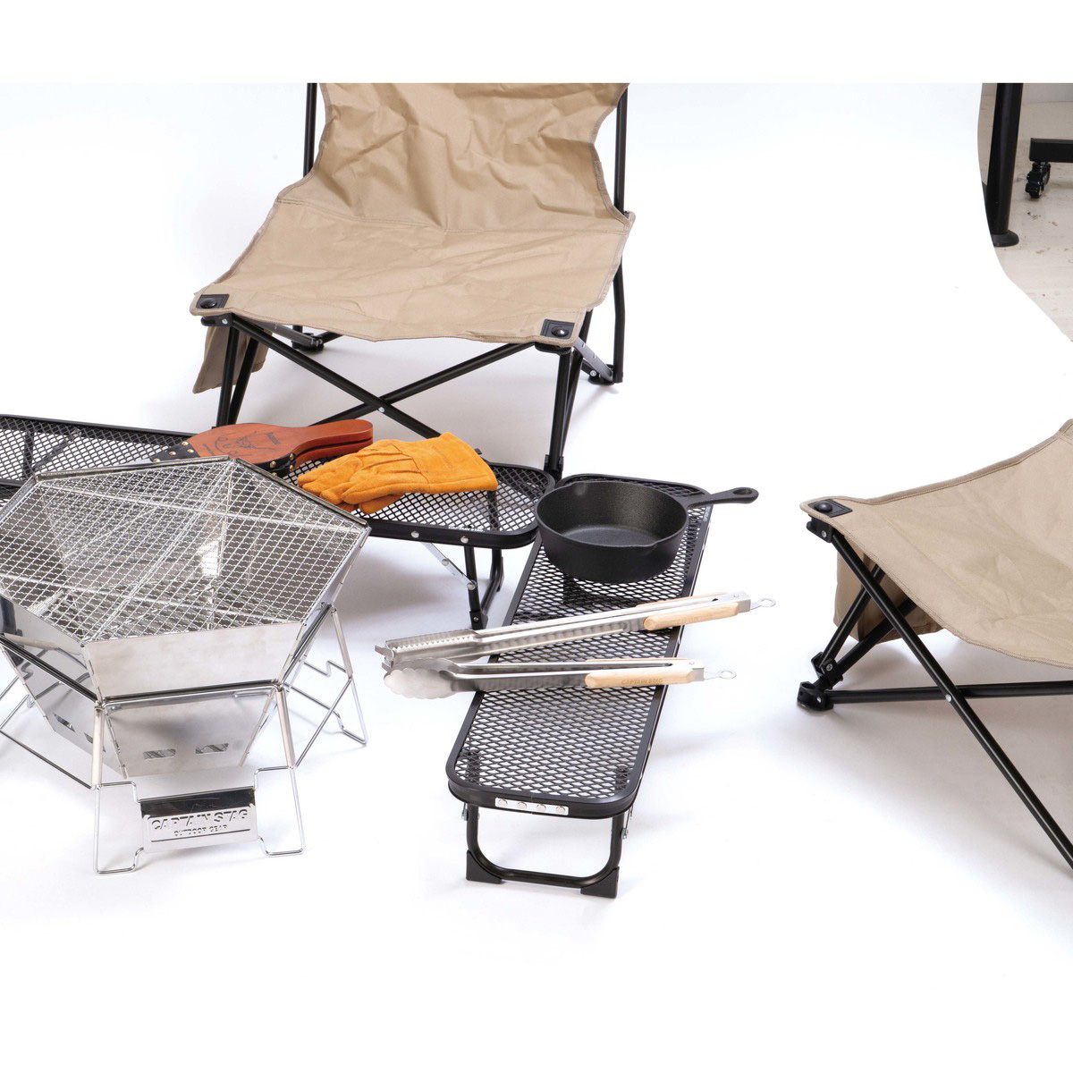 耐熱性の高いスチールメッシュ天板なので、火にかけた鍋やスキレットなどが直接置けます。