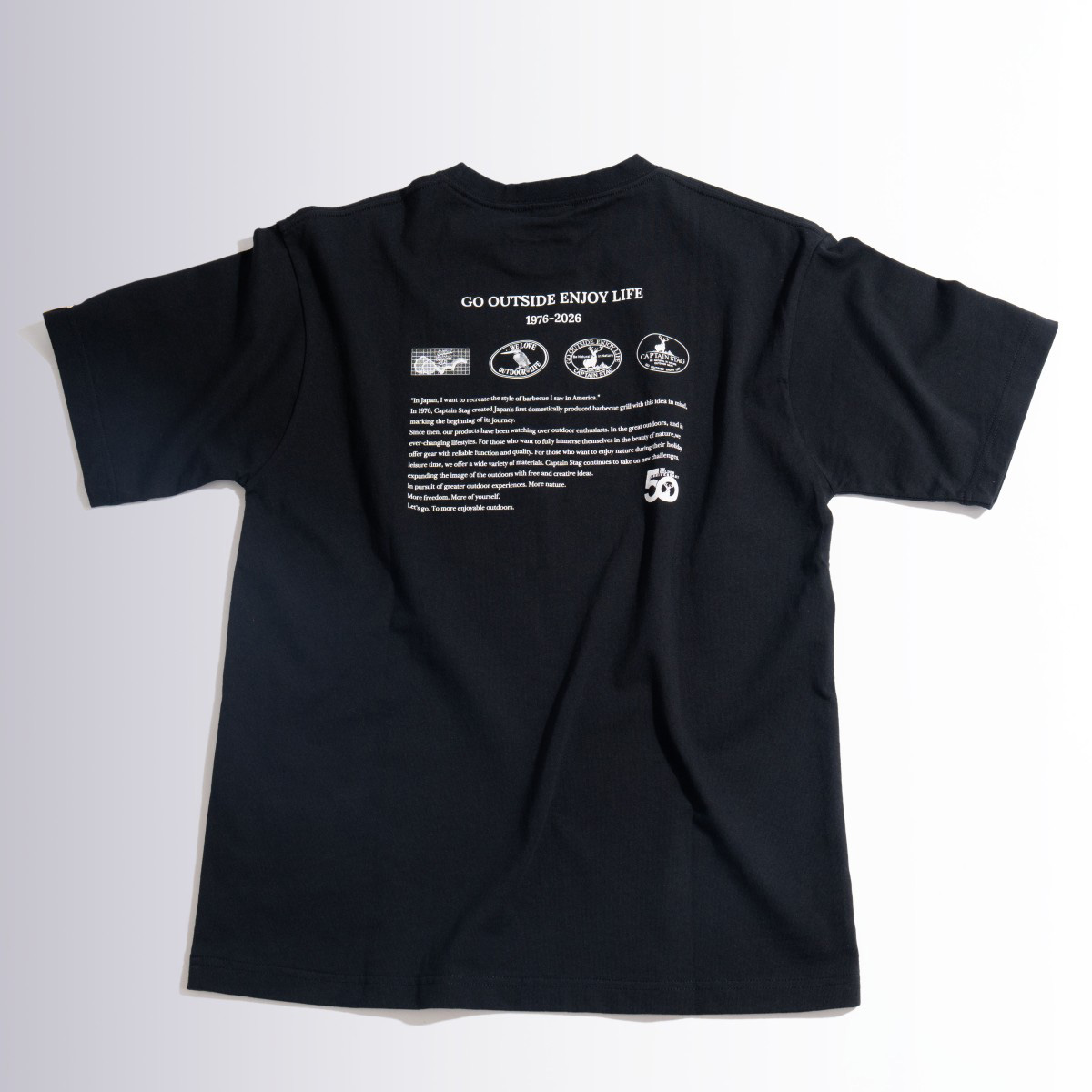歴代ロゴとアウトドア文化をサポートし続けるメッセージをあしらった50周年代表モデルTシャツ。